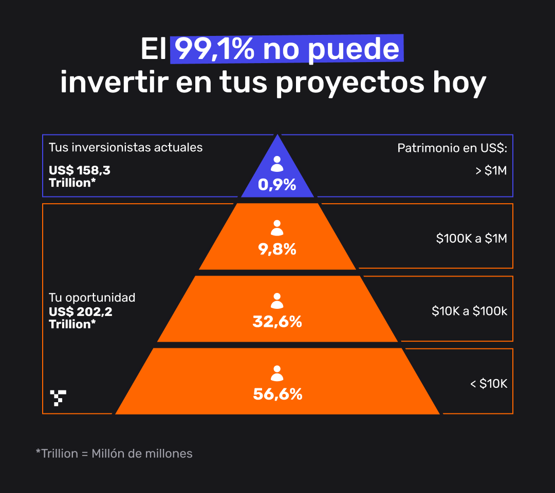 Con Fraccional puedes levantar capital sin depender de bancos ni fondos institucionales. Lo haces mediante cientos de pequeños inversionistas —personas reales que antes estaban fuera de tu alcance— y además, te ayudamos a construir tu propia comunidad, no solo para este proyecto, sino para los que vengan después.