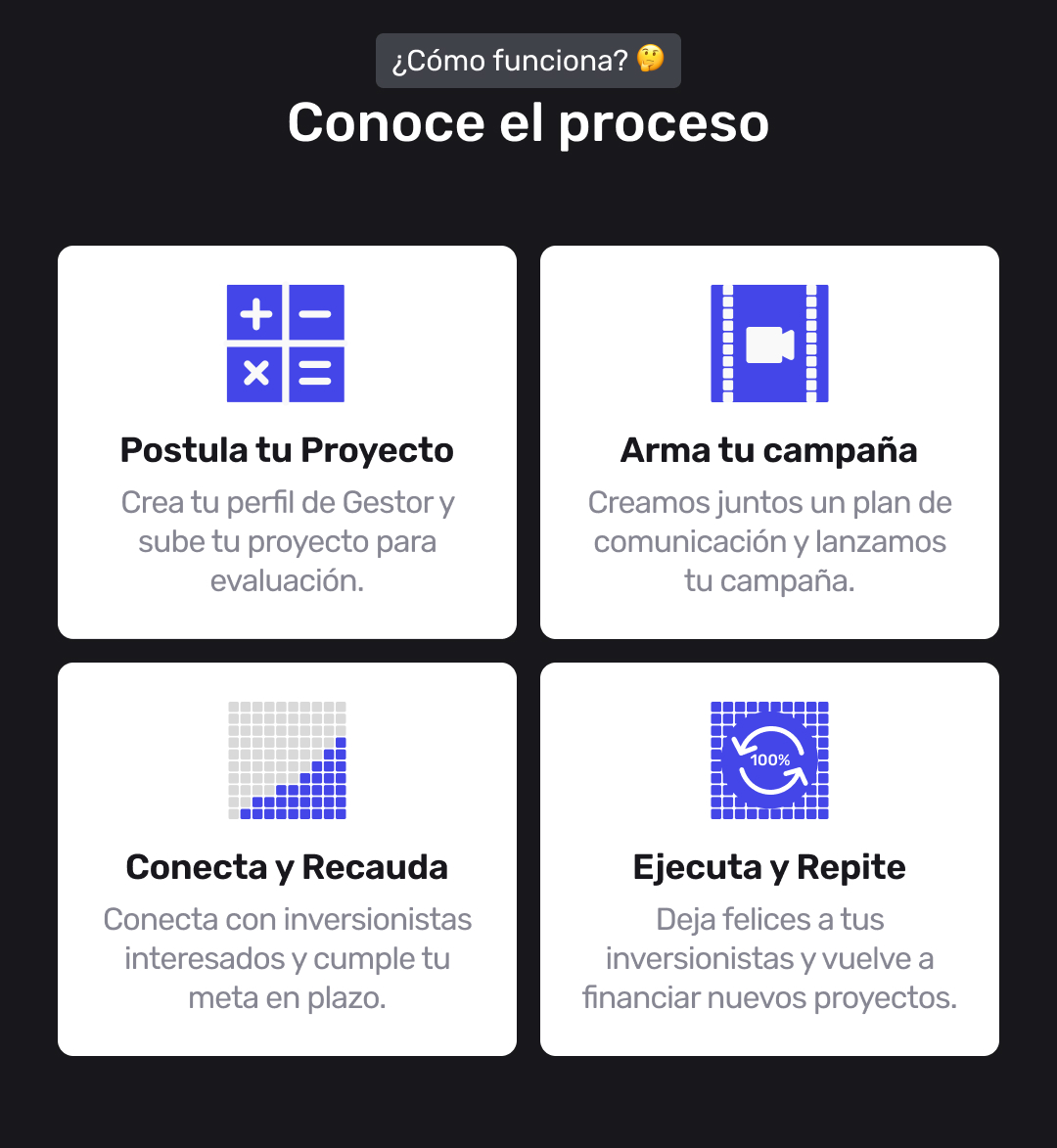 Toda la comunicación con inversionistas pasa por nosotros, por lo que no necesitas gestionar a cientos de socios directamente. Solo te pedimos una reportería mínima según el tipo de proyecto. Los levantamientos suelen durar entre 30 y 90 días, y el monto dependerá de cuánto tiempo puedes esperar y cuán bien conecta tu proyecto con la comunidad de Fraccionistas.